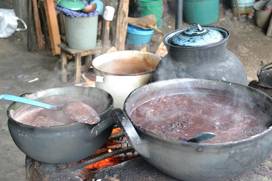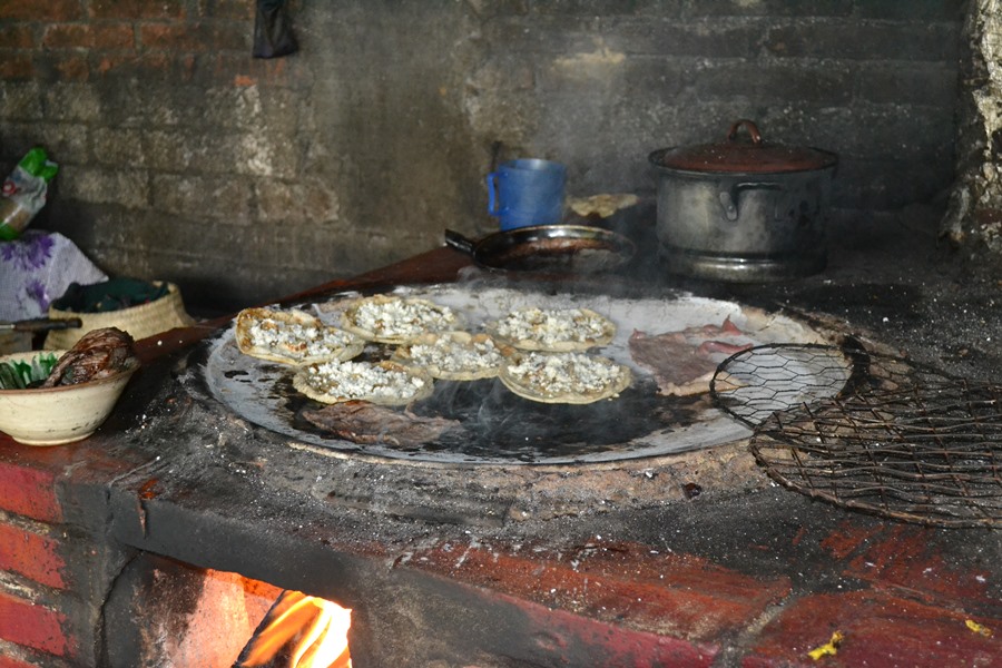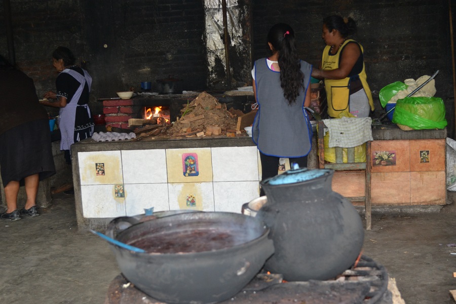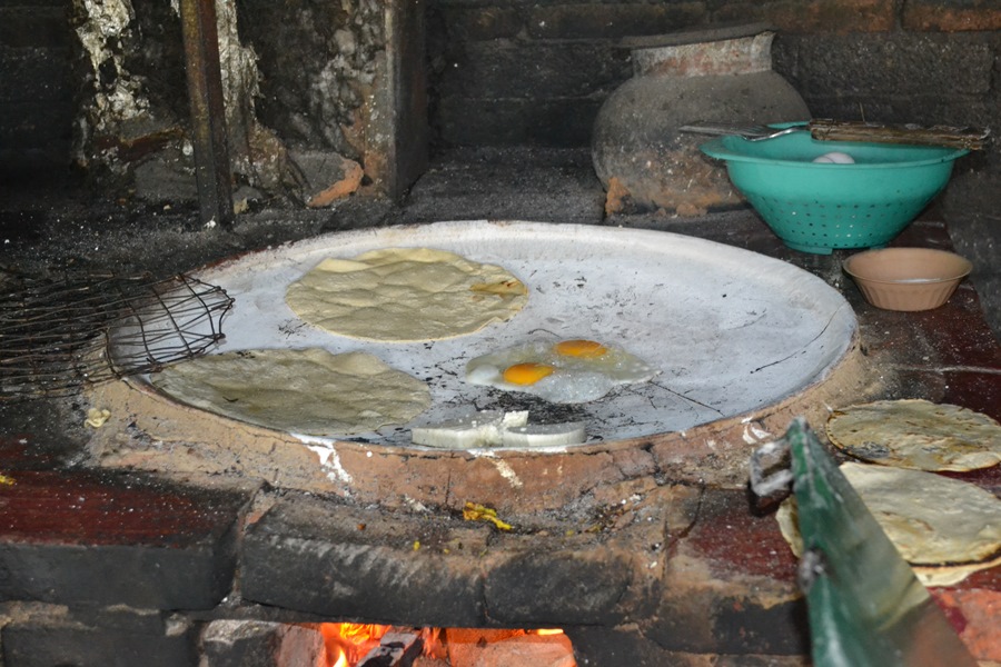 Por fuera, pareciera una casa humilde, de lámina, con una puerta siempre abierta; adentro, el patio de una casita de rancho, con gallinas caminando en la tierra, entre las mesas, algunas con tablones y otras de plástico; en una esquina de un corredor, los fogones con leña donde están los frijoles y el café, y los comales al fondo.