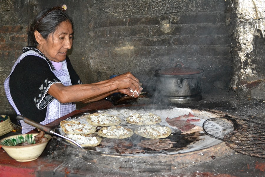 Ofrecen pollo enchilado, frijoles con tasajo, huevos al comal, enfrijoladas y memelitas que acompañan con frijol o con tasajo; de bebidas, chocolate de agua o café.
