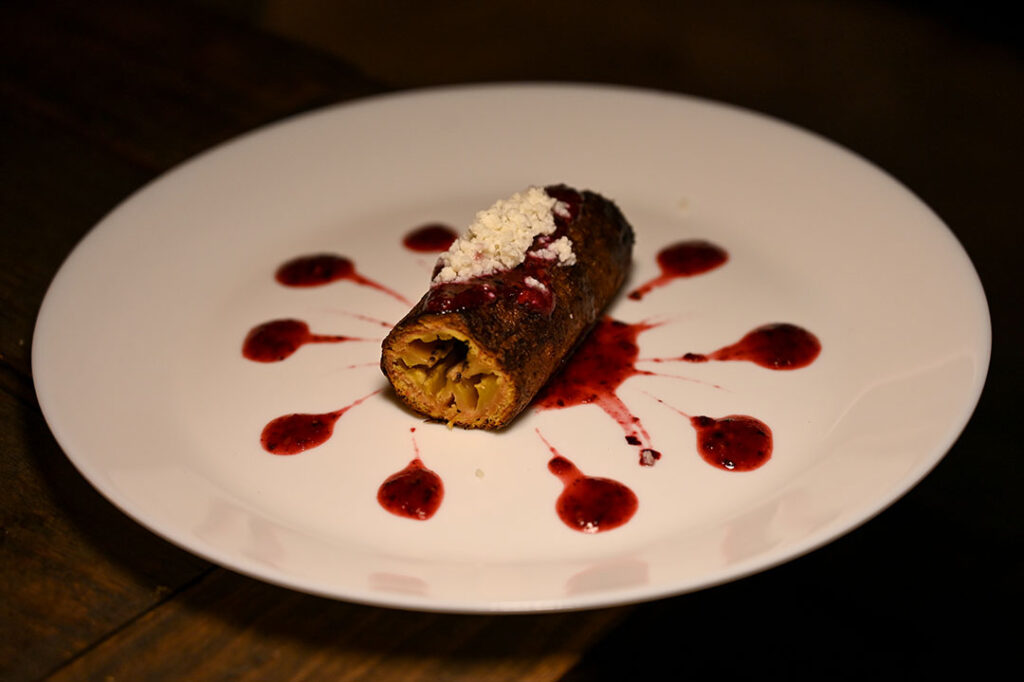 El último plato baja el ritmo: plátano macho flameado con mezcal y frutos rojos.